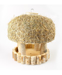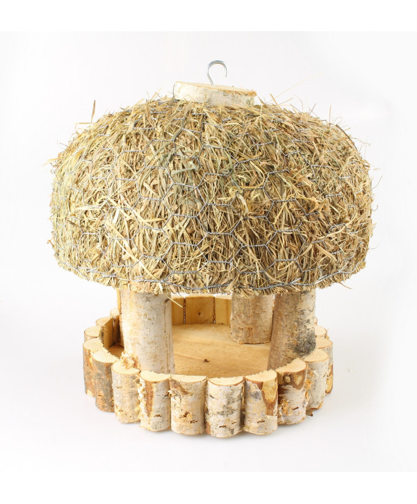Krásne a exkluzívne kŕmidlo na vtáčiky LUXO vyrobené kombináciou dreva a sena.