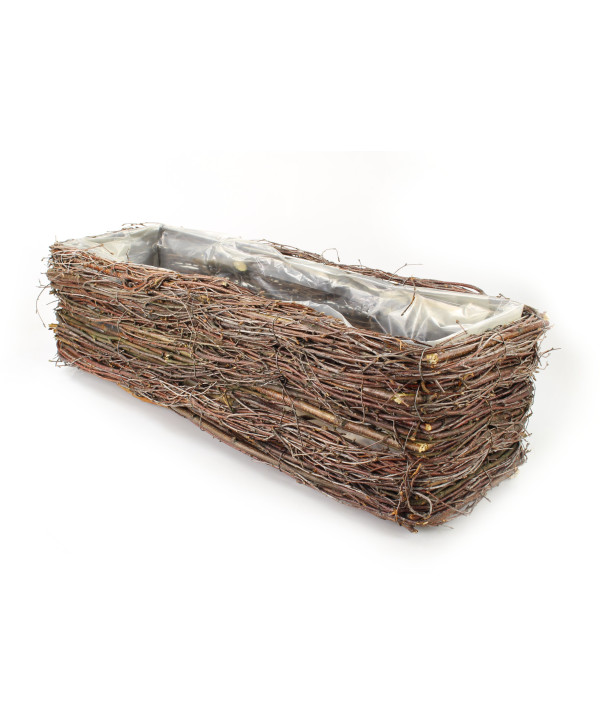 Krásny brezový kvetináč HRANY opletený brezovou metlinkou na kovovej konštrukcii, je vystlaný igelitom.