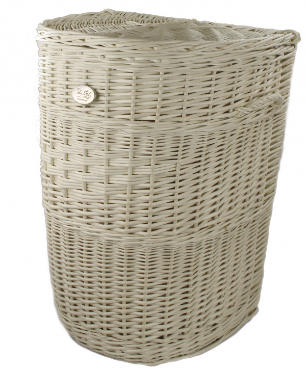 Prútený prádlový kôš Elisabet White, jeho poloblúkový tvar je určený na umiestnenie k stene.